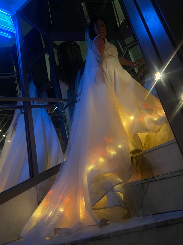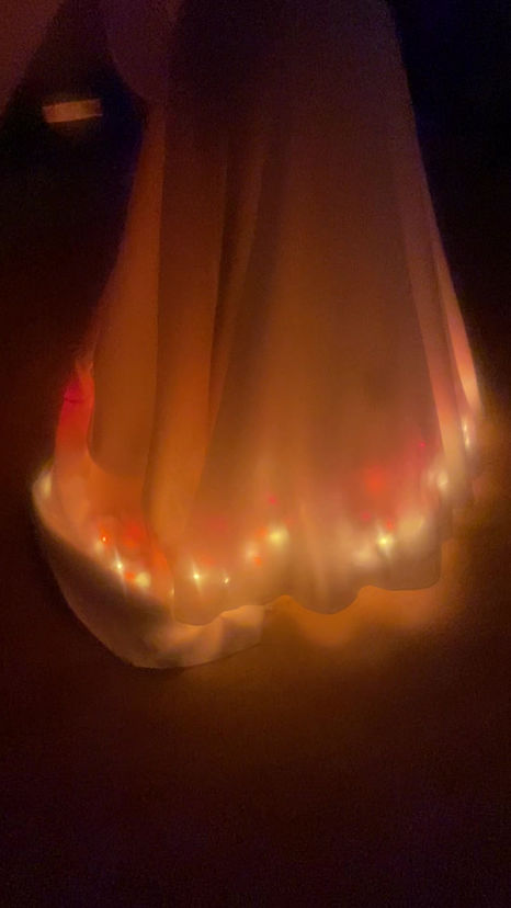 Nach dem ich das Brautkleid kürzer und enger genäht habe, erfüllte ich ihr den Wunsch ...mit 30m Lichterketten und flackerndem Effekt.